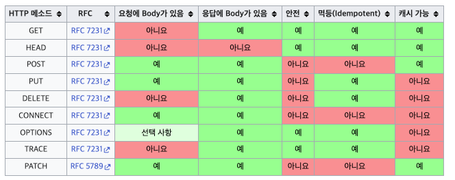 HTTP 메서드에 대해서 전체적으로 정리한 표를 참고하자