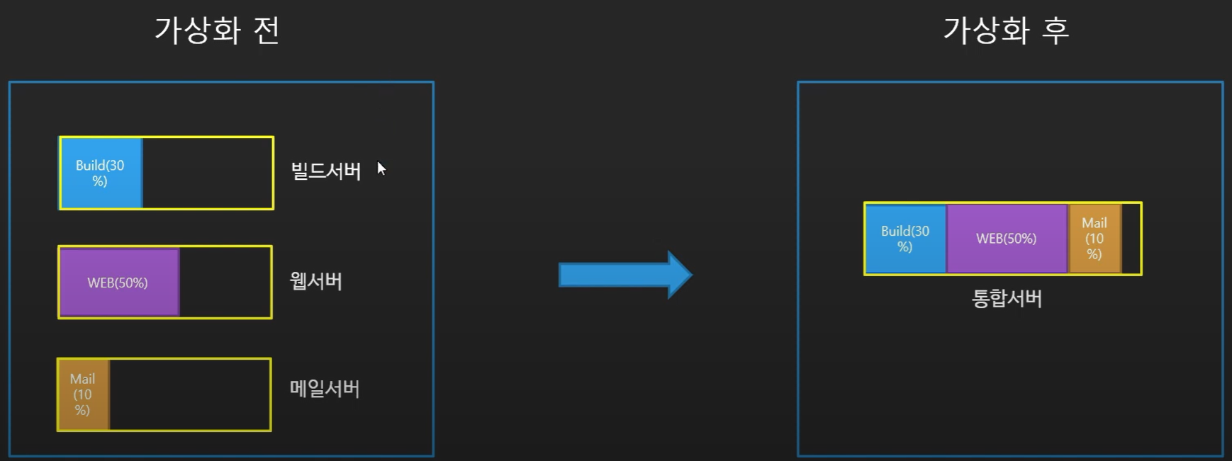 - 하이퍼바이저를 이용하여 여러 개의 가상 머신을 단일 서버에서 실행할 수 있게 됨