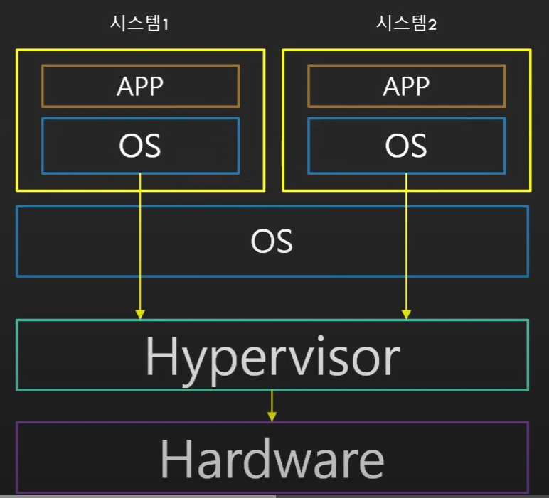 - 하이퍼바이저: OS와 하드웨어 사이에 존재하는 일종의 가상화 매니저
