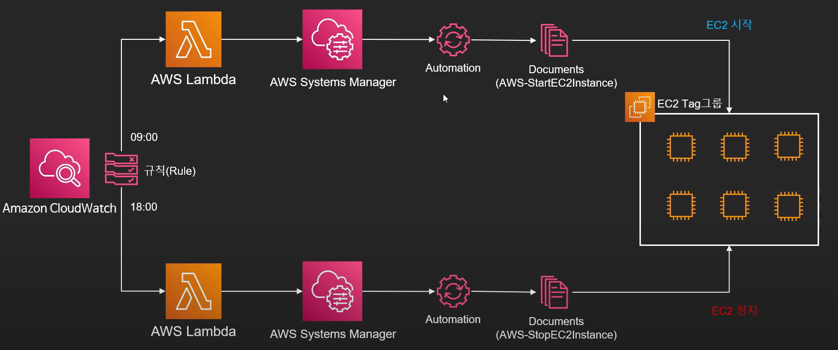 EC2 서비스를 통해 EC2 자동 정지/시작이 가능하다.(무중단 서비스 아닐 경우 권장, 요금 절약 효율화 극대)