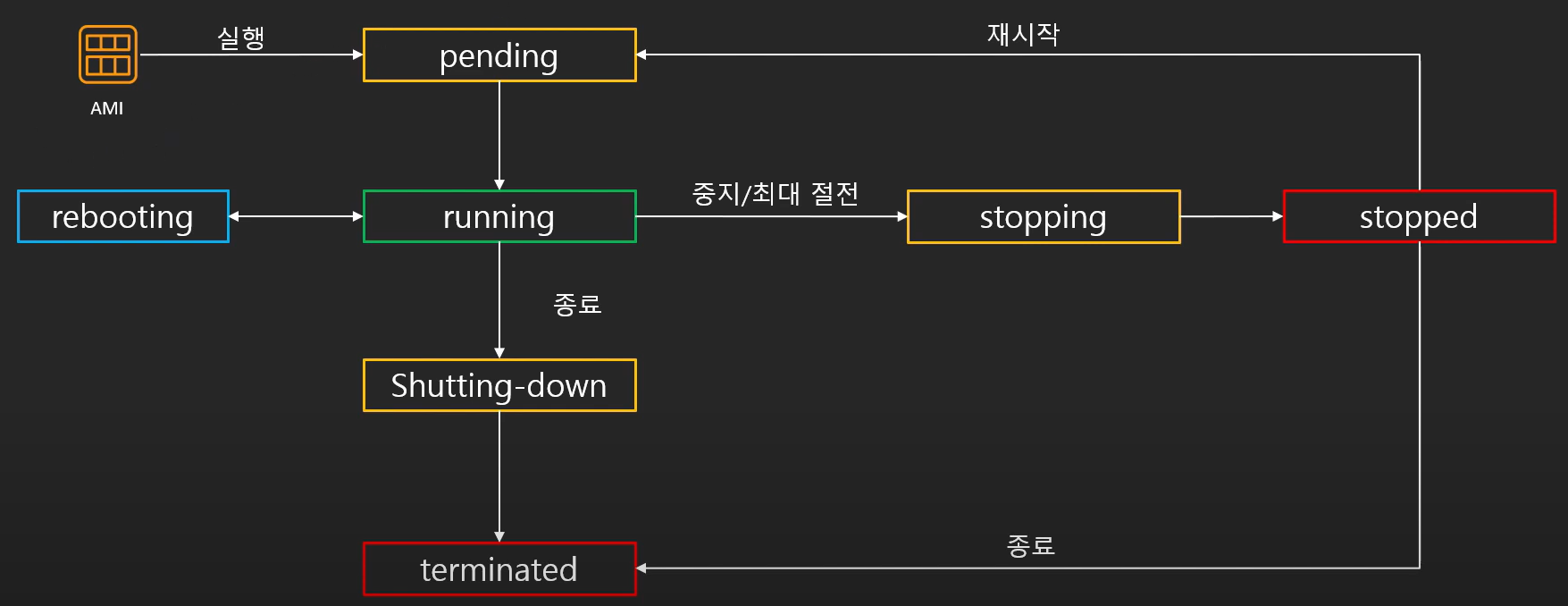 ec2 생명주기란 AMI로 부터 실행되고 나서 종료되기까지의 ec2의 일련의 과정을 말한다.