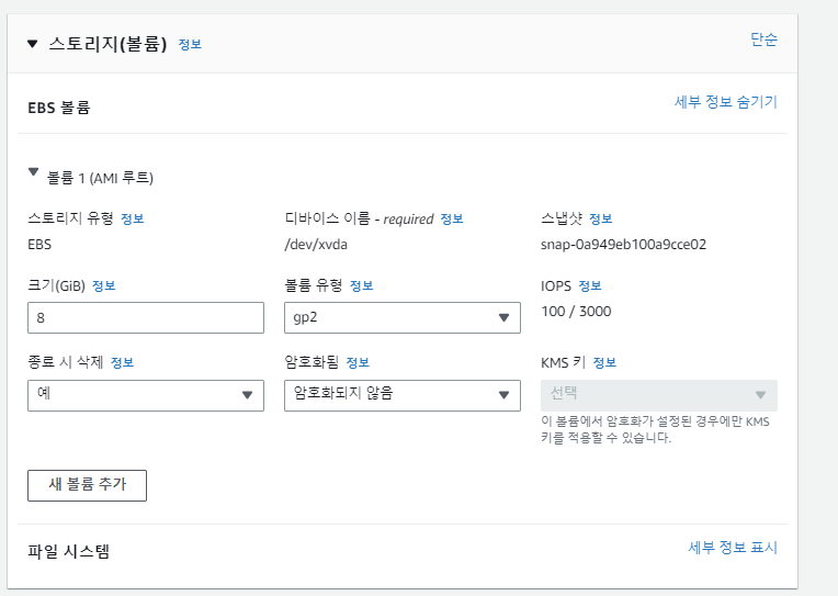 - 볼륨 유형: 위에서 설명 한 EBS 타입(범용, 마그네틱 등..)