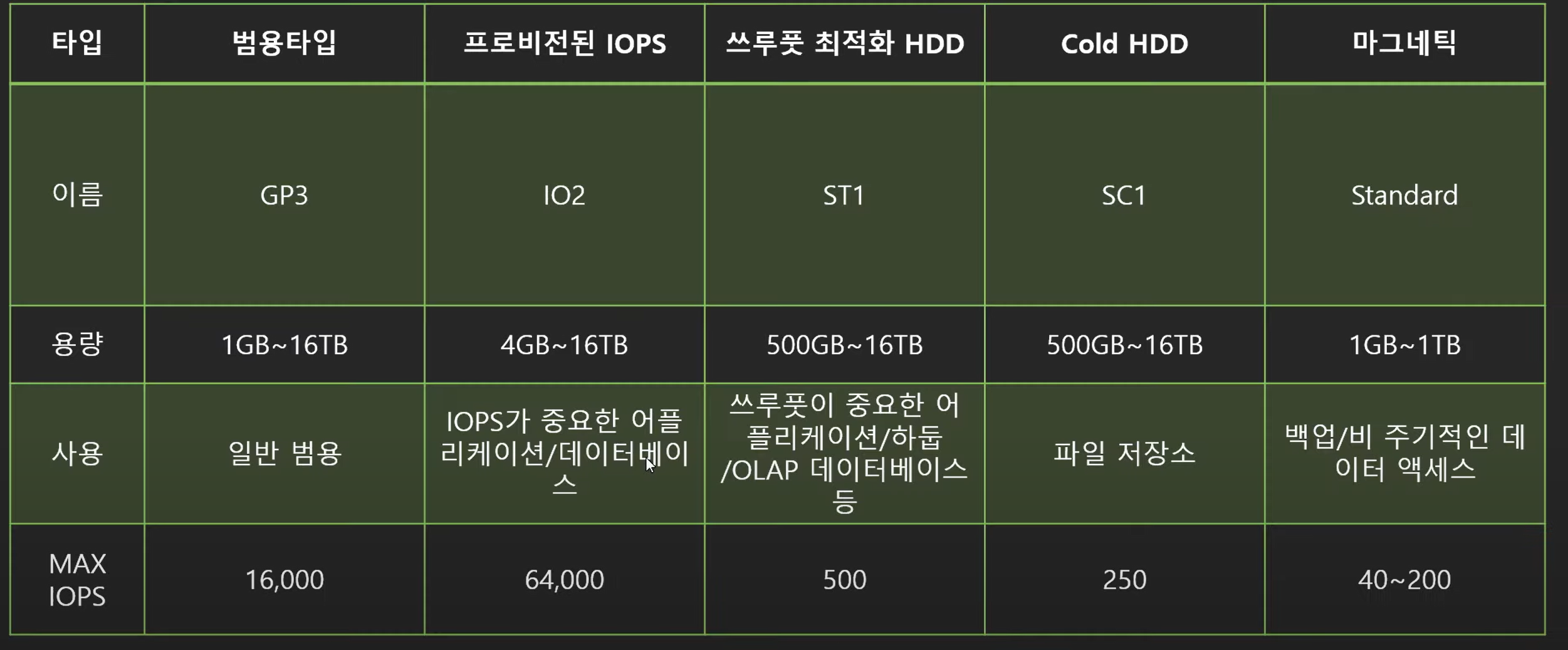 - 총 5가지 타입을 제공( *IOPS(Input/Output Operation Per Second): 입출력 처리 속도 측정 단위)