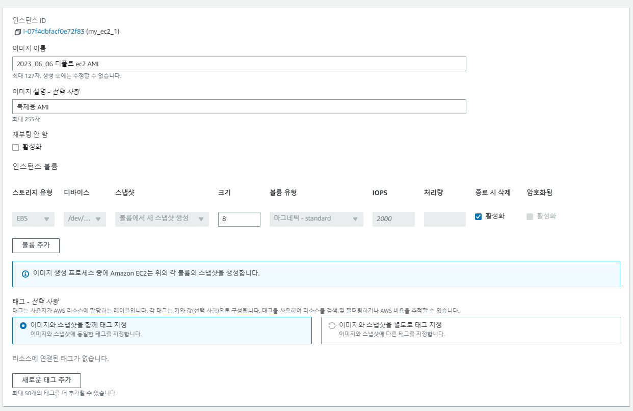 2. 이미지 이름, 설명 등 입력(재부팅 안 함 활성화 X, 종료 시 삭제 활성화 O) 후 이미지 생성