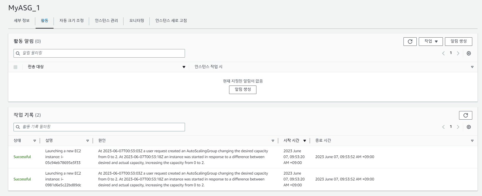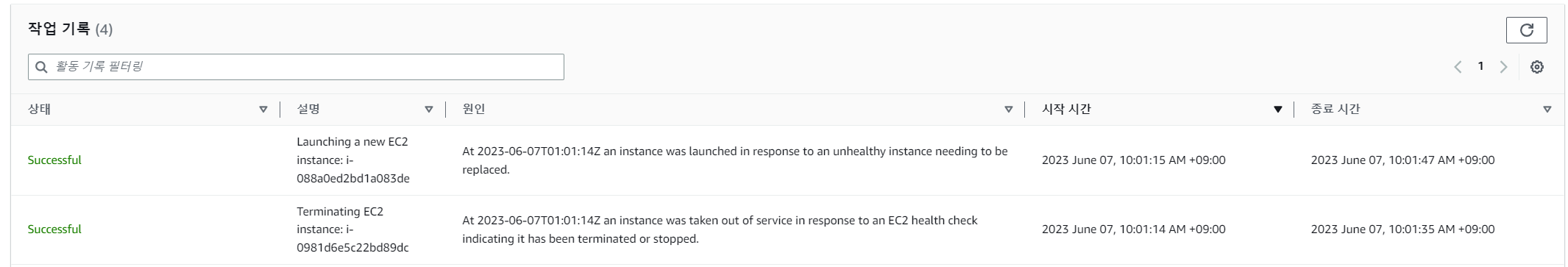 2. 오토스케일링에 가서 활동 > 작업 기록 보면 하나가 종료되었고 EC2 인스턴스를 하나 런치해서 대체했다는 기록을 볼 수 있다.