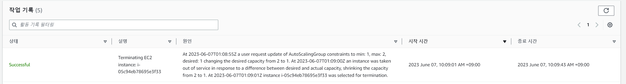 5. 오토 스케일링 기록을 보면 용량 변경 로그로 인해 하나의 인스턴스(instance i-05c94eb78695e3f33)가 종료된 것을 볼 수 있다.