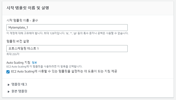 4. 오토 스케일링 이름 입력 및 시작 템플릿 설정