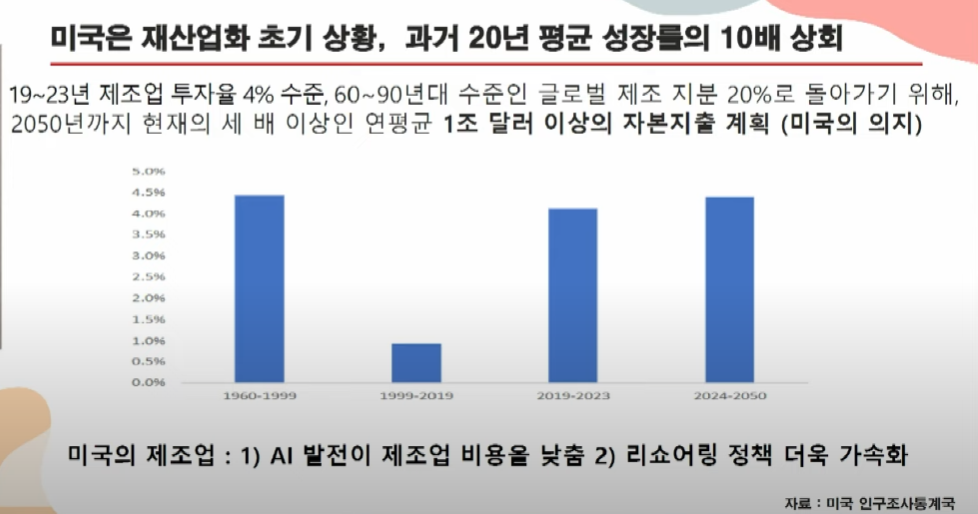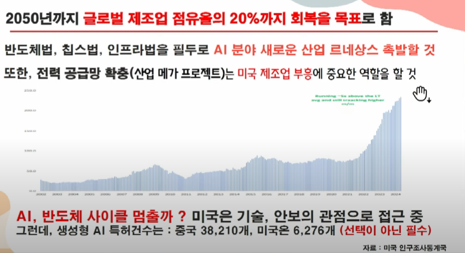 결국, 미국은 리쇼어링과 보호무역을 통해 기술 혁신(AI, 반도체 등..), 공급망 안정화, 고급 인력 양성 등 다양한 측면에서 생산성 향상을 도모할 수 있는 강력한 무기를 구축 중이다.