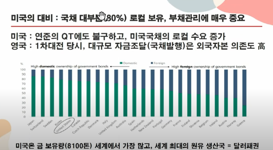 6. 미국 부채는 많지만, 국채 대부분은 로컬(미국 국내 투자자)이 소유하고 있음. 외국자본 의존도가 낮아, 리스크가 적어짐