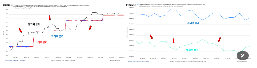1. 연준의 금리 인상으로 역레포 금리가 상승하자 시장 참여자들은 은행에 유치해 뒀던 자금을 역레포 자금으로 이동시켰으며, 이에 지준금이 감소하고 역레포 잔고가 증가했습니다.