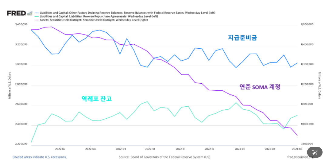 쉽게 말해, 연준의 긴축으로 인한 지준금 감소폭을 금융기관들이 역레포 잔고에서 자금을 인출해 단기채를 매입함으로써 일정 부분 상쇄했다고 볼 수 있습니다.
