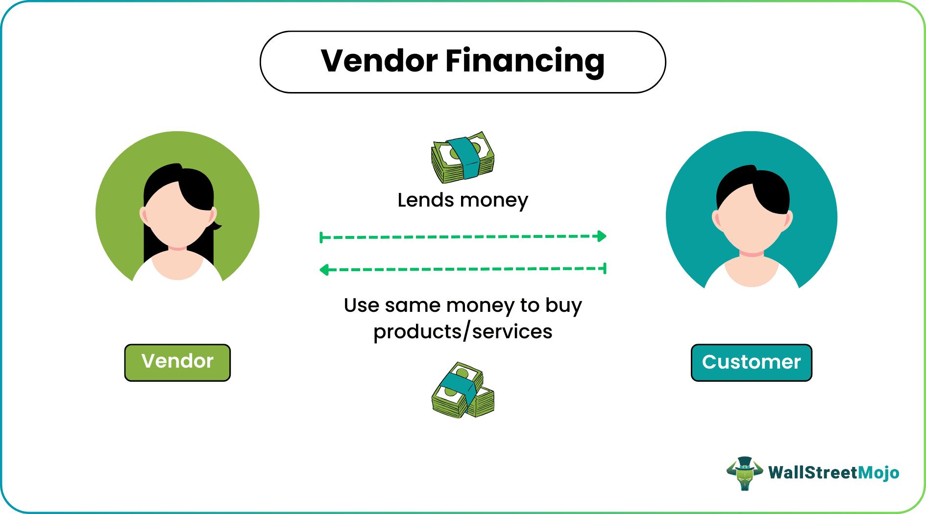 보통 거래는 "구매자" -> "돈 지불" -> "판매자 상품제공"이라는 프로세스를 거치게 되는데, 벤더 파이낸싱은 "판매자 상품제공" -> "구매자 상품 획득"이라는 과정을 거치게 되고 판매자는 구매자에게 신용(대출)을 제공하는 구조가 된다.