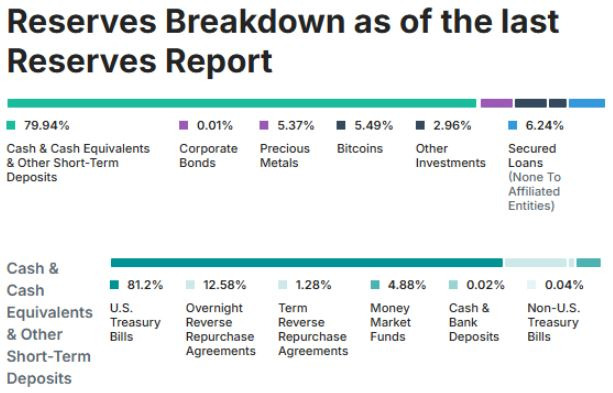 테더는 약 80%를 현금 및 현금성자산으로 구성하고 있습니다.