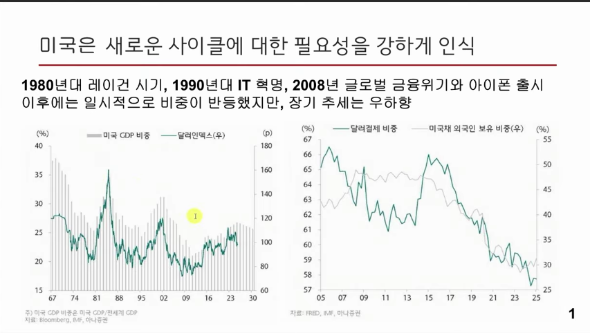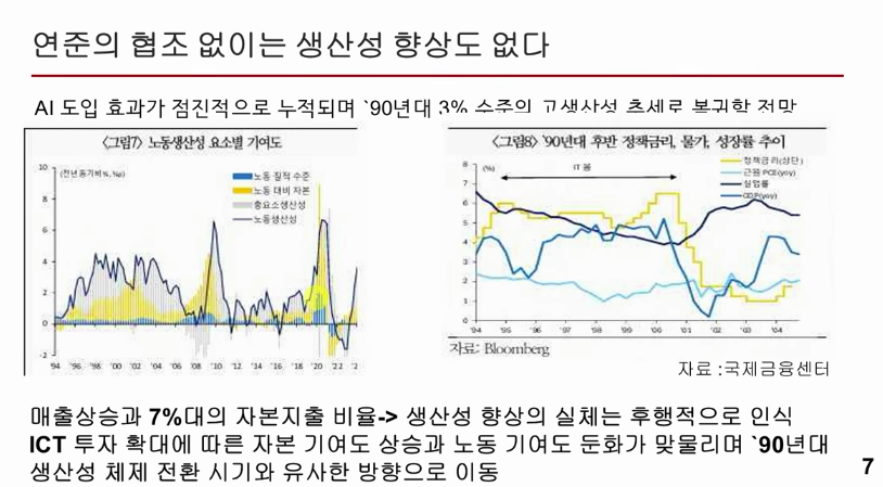 -> 총 요소생산성(TFP) 반등으로 체감 효율 개선(닷컴 시기 유사 경로)하고 생태계 선점으로 후발국 추격 차단, 기술주도의 성장 동력 확보
