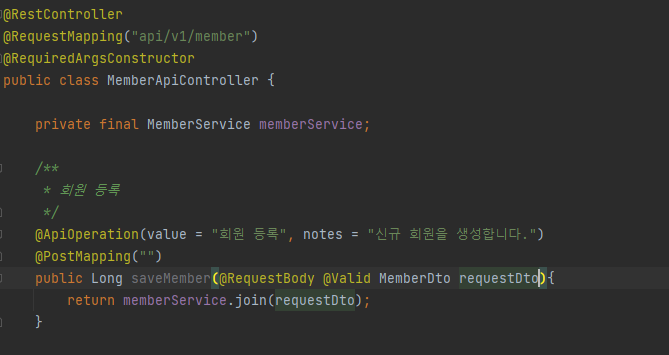 그림 4의 member-api-controller에서 post옆에 보면 "회원 등록"이라는 description이 있다.