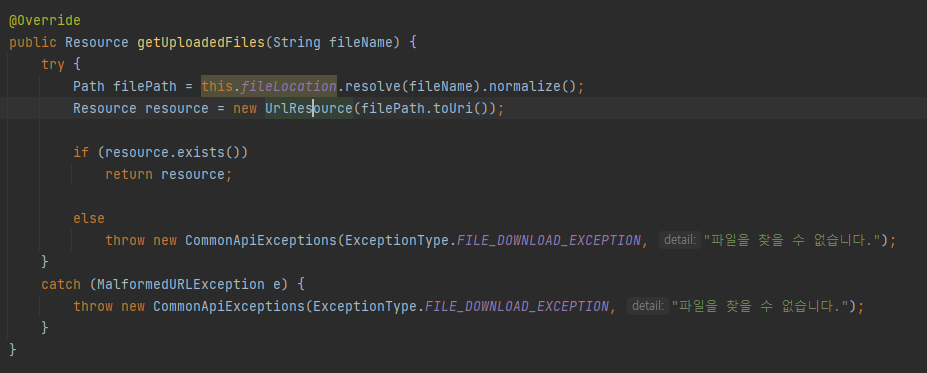 그리고 path값을 URLResoure 객체 파라미터로 넘겨 Resource로 변환하여 객체 생성 후 리턴한다.