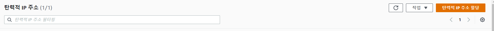 왼쪽의 카테고리의 네트워크 및 보완에서 탄력적 IP(고정 IP)를 선택합니다. 그 이후 오른쪽 상단 위의 탄력적 IP 주소 할당을 클릭합니다.