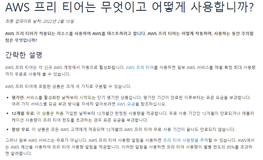 AWS는 프리티어를 통하여 1년 동안 일부 무료(제한적임)로 사용할 수 있는 계정을 제공하고 있습니다.