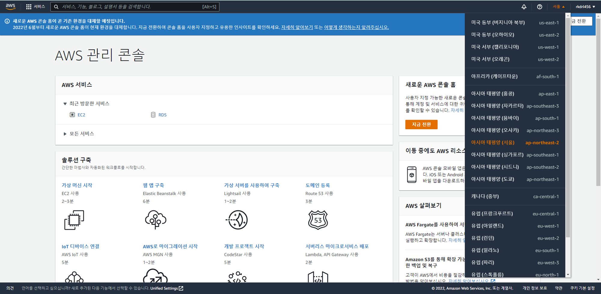 로그인 후 아래 그림처럼 화면이 보이실 텐데 오른쪽 위의 *리전을 아시아 태평양(서울)으로 변경하셔야 합니다.