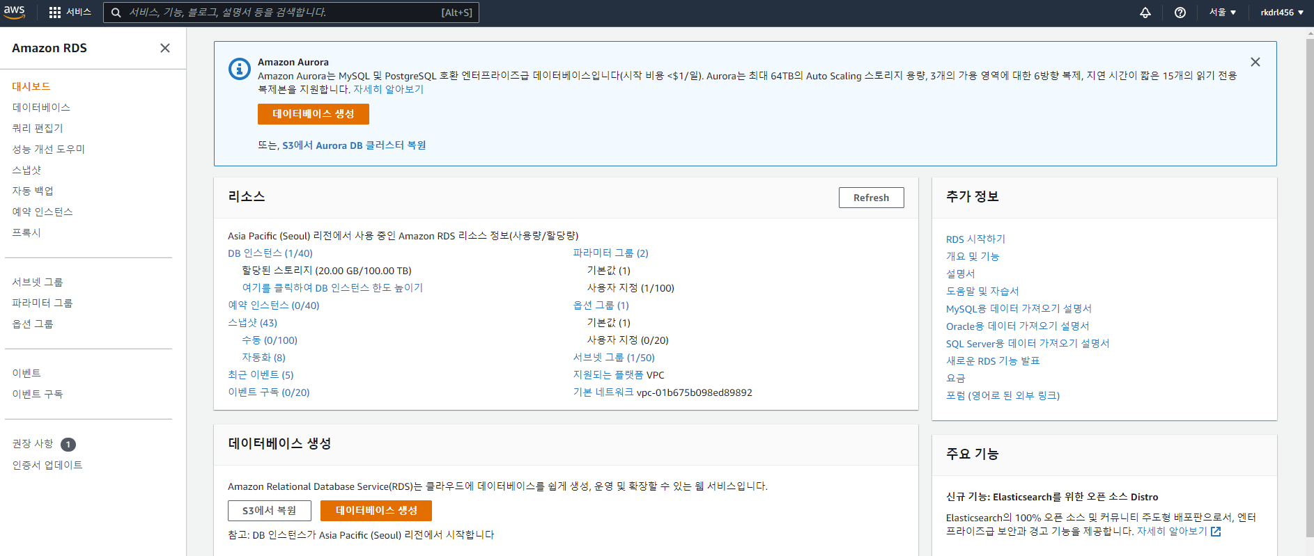 참고로, Amazone Aurora가 AWS에 제공하는 DB인데 MySQL과 PostgreSQL을 클라우드 기반에 맞게 재구성한 DB입니다. 성능도 RDS MySQL 대비 5배, RDS PostgreSQL 보다 3배 성능을 제공하고 AWS에서 직접 엔지니어링하고 있기 때문에 지속적으로 발전하고 있고, 기능적으로 우수하지만 무료가 아니라 저는 MySQL을 선택하였습니다.