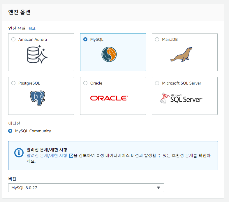 RDS 서비스에 접속하여 데이터베이스 생성을 클릭 후 DB와 버전을 선택합니다.