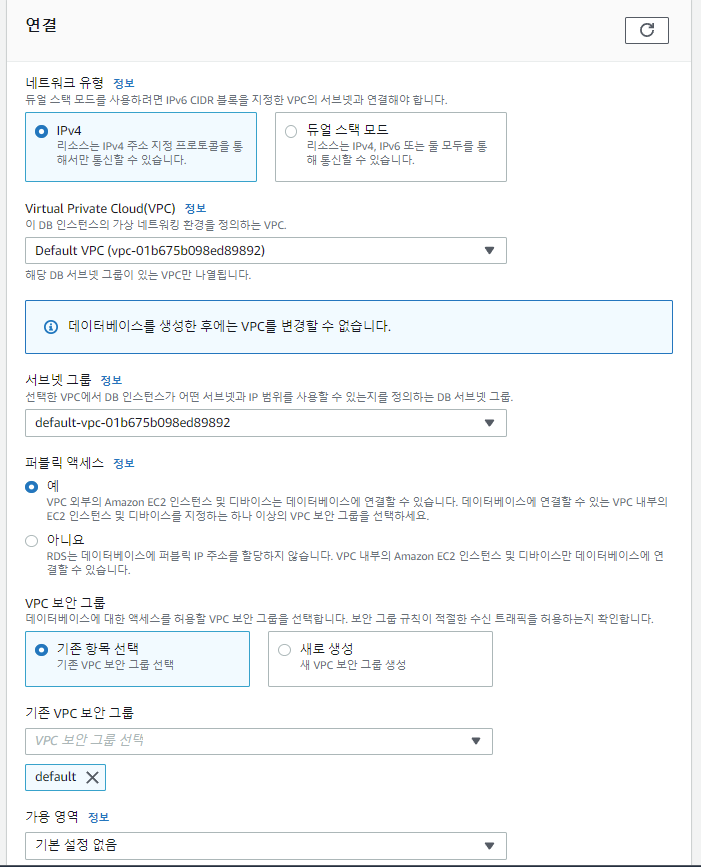 연결 부분에서는 퍼블릭 엑세스를 "예"로 선택하셔야 합니다.(이후 보안 그룹에서 추가 설정)