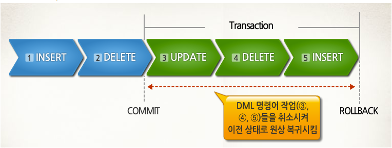하나의 트랜잭션에는 N개의 SQL(질의어)가 포함되어 있다. 하나의 트랜잭션은 Commit 되거나 혹은 Rollback이 되어야 한다.